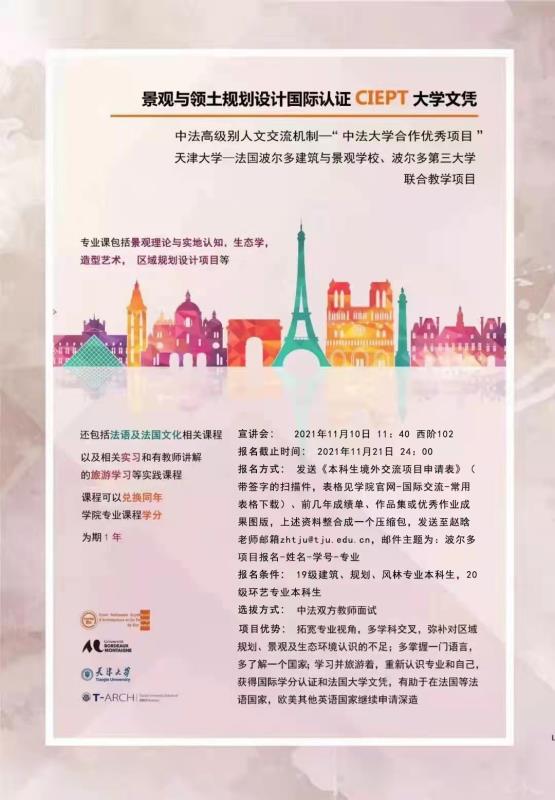 Registration: Send a compressed package with (1) the "Undergraduate Overseas Exchange Program Application Form"(Scanned copy with signature, the form can be found on the official website of the college-International Exchange-Common Form Download); (2) transcripts of previous years and (3) portfolios or excellent works to teacher Zhao Han's mailbox zhtjuetju. edu.cn. The subject of the email is: Bordeaux project registration-name-student number
