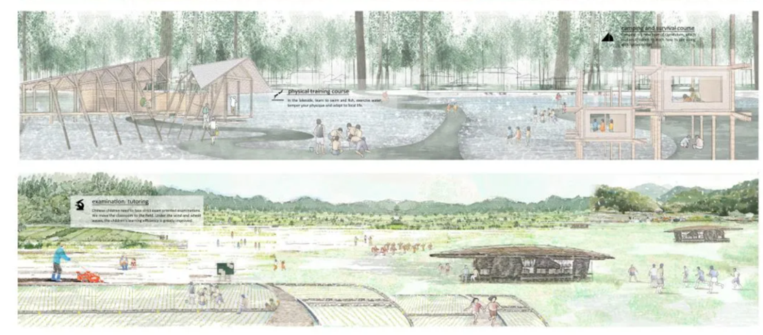 The design is located in a small village in southern China. Based on its culture and natural resources such as farmland, forest, lake and grass, five courses and their architectural forms are designed in detail. These small buildings are constructed with local materials such as bamboo, wood and stone. Children here take nature as their teacher, take the countryside as their classroom. They study on the ridge, among the woods, beside the stream.... Virtually, the countryside is no longer the supplier of the city, it will become a unique place for natural education.