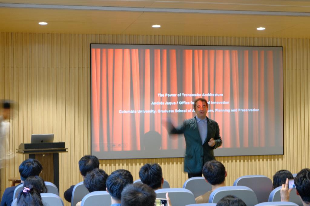 On 26 September 2023, a lecture entitled "The Power of Transscalar Architecture" was held in the lecture hall on the ground floor of the School of Architecture, Tianjin University, by Professor Andrés Jaque, Dean of the GSAPP School at Columbia University.