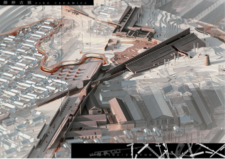 Line/Vector" is the "8+" graduation design work of architecture majors in China. The topic is located in Yanshen Ancient Town of Boshan District, Zibo City, which is the "Porcelain Capital of the North of the Yangtze River", and focuses on exploring the renewal strategy of the historical area where traditional residential houses coexist with industrial heritage in the present city, and constructing a renewal strategy by doing so. It focuses on exploring the regeneration strategy of the historical area where traditional houses and industrial heritage coexist in today's city, and constructing a place experience with historical and cultural thickness. The design proceeds sequentially from the different scales of "City-Ancient Town-Architecture", abandoning the harmonious spatial dialogue formed entirely by environmental texture, adopting the logic of landscape narrative and linear design to complete the expression of spatial paths with a strong narrative and combining the introduction of light and shadow, the collocation of materials, and the scale of the design. Combined with the introduction of light and shadow, the matching of materials and the special shaping of the scale, it creates a ceramic showroom with a quiet atmosphere. The design organically integrates the regional nodes of Yan Shen Ancient Town, emphasises the historical lineage and regional characteristics of the town, and connects the existing cultural resources of the site.