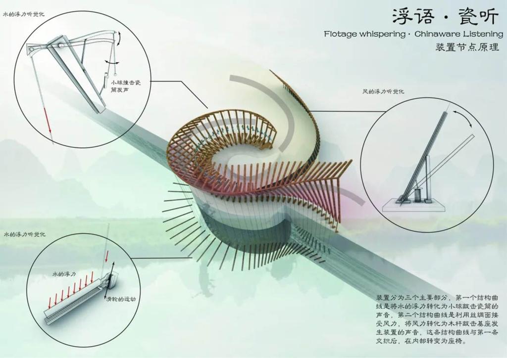 Du Jiacheng and Wang Haoyi with their work "Flotage Whispering•Chinaware Listening" won pastoral facility track gold medal. Ye Xiaomeng and Wang Yiheng’s work "Fuliang Ecological Tea Experience Station" won gold medal of the environmental design track.