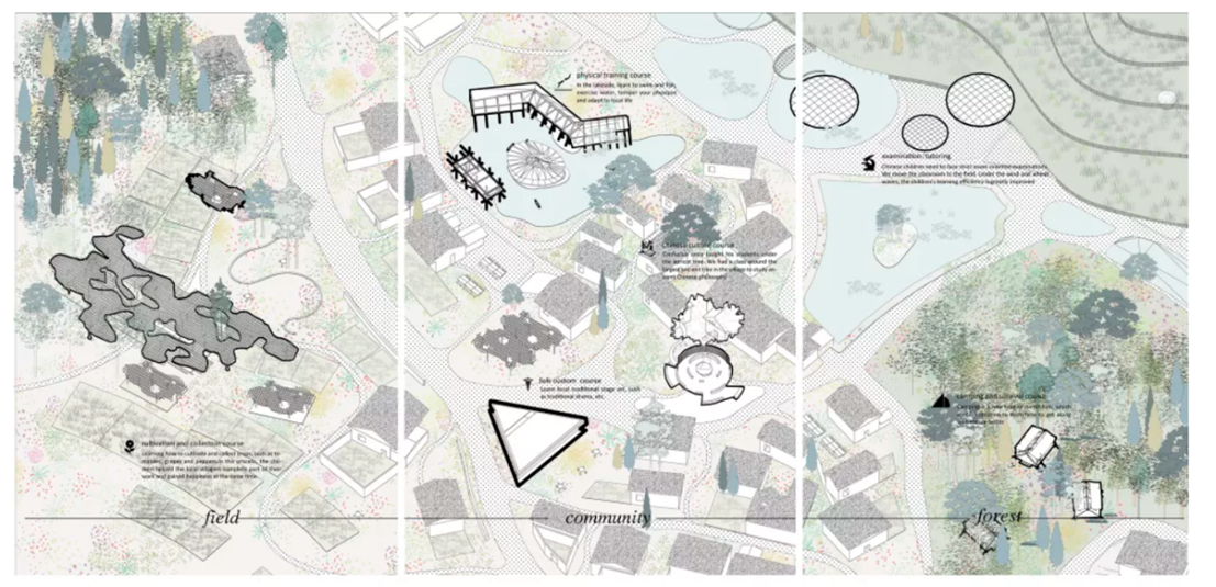 The design is located in a small village in southern China. Based on its culture and natural resources such as farmland, forest, lake and grass, five courses and their architectural forms are designed in detail. These small buildings are constructed with local materials such as bamboo, wood and stone. Children here take nature as their teacher, take the countryside as their classroom. They study on the ridge, among the woods, beside the stream.... Virtually, the countryside is no longer the supplier of the city, it will become a unique place for natural education.