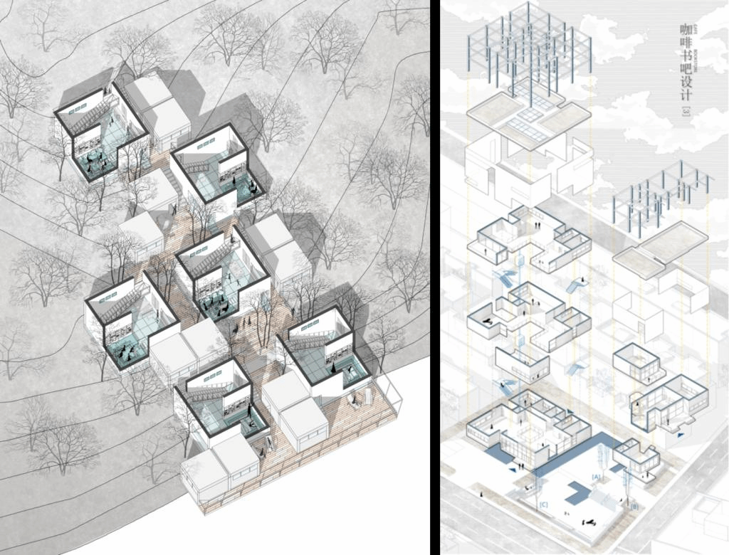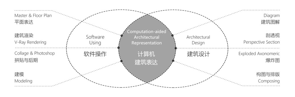 As the connection of software using and architectural design, the course of Computer-aided Architectural Representation is set up for sophomore with a heuristic and practical teaching method, in order to stimulate students’ interests of spatial design representation, and establish a sustainable experience sharing platform, through crushing one by one the drawing problems of plan, modeling, rendering, collage, axonometric, diagram and composing.