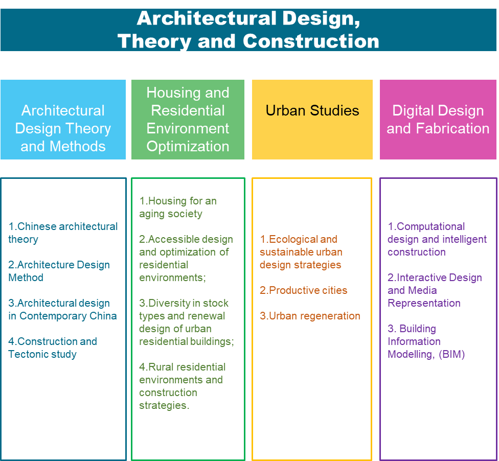 Architectural design and theory is the core component of Architecture as a discipline, which includes the following four main research areas: (1) architectural design theory and methods; (2) housing and residential environment optimization; (3) urban studies; (4) digital design and fabrication.
