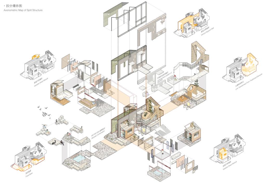 Aiming at the existing problems in modular design, which are pattern's simplicity of the module and how to connect the form design of module with construction, the project reexamines the generating mechanism of architecture modular design. By applying the method of digital information technology, the research contains three aspects: the optimization design method of module unit, the optimization design method of group combination, as well as the constructive feasibility of optimal design. Firstly, utilizing the parametric programming tools, the research combines shape grammar and constructing logic to transform entity module into information module. By adjusting parameters, the probability and adaptability of the module's form generating can be extended; Secondly, on the basis of utilizing algorithm logic to realize the diversity of the modules combination, by applying the method of space syntax analysis and 3D virtual reality technology, the research obtains the optimal solutions to the modular space combination from the perspective of quantitative; Finally, by applying Kangaroo, SAT2000, Revit information model, the constructive feasibility of optimal design is verified, which forms a feedback to the design. Based on digital information technology, the project proposes a modular design method to update and optimize form generating and space operation mode of the existing modular design and promotes the transformation from design to construction, meanwhile to provide guidance for practical applications.