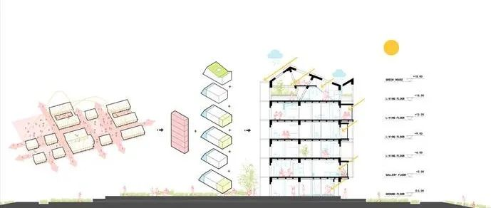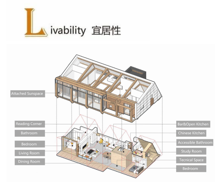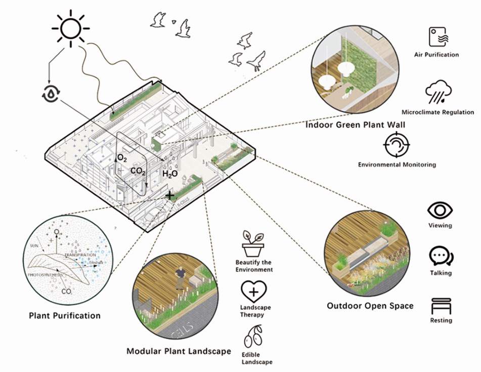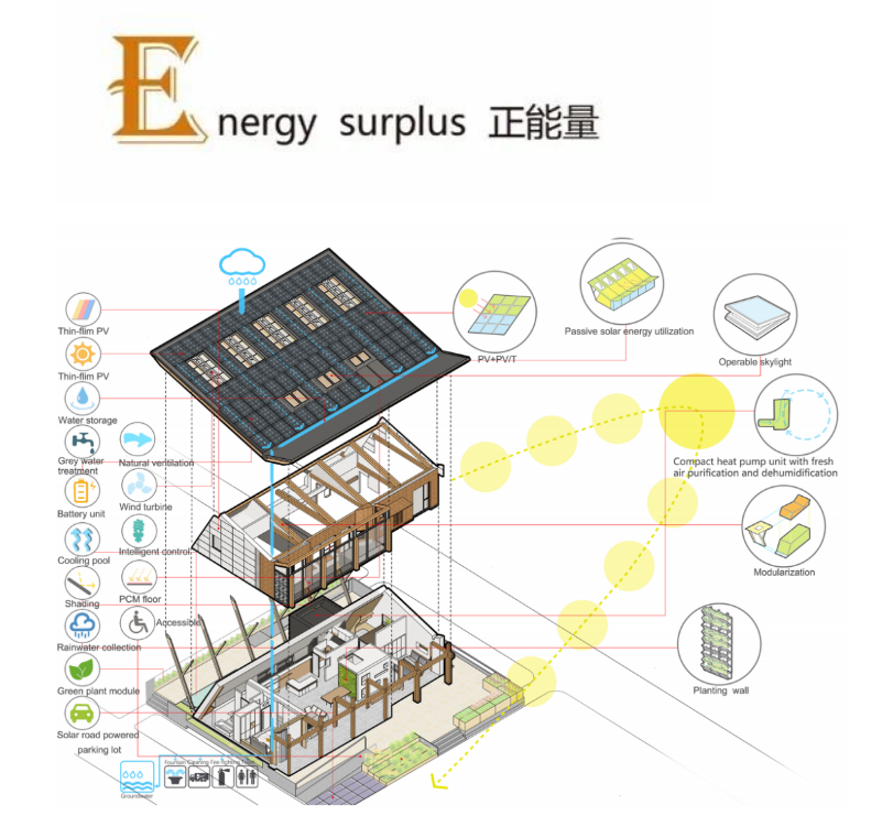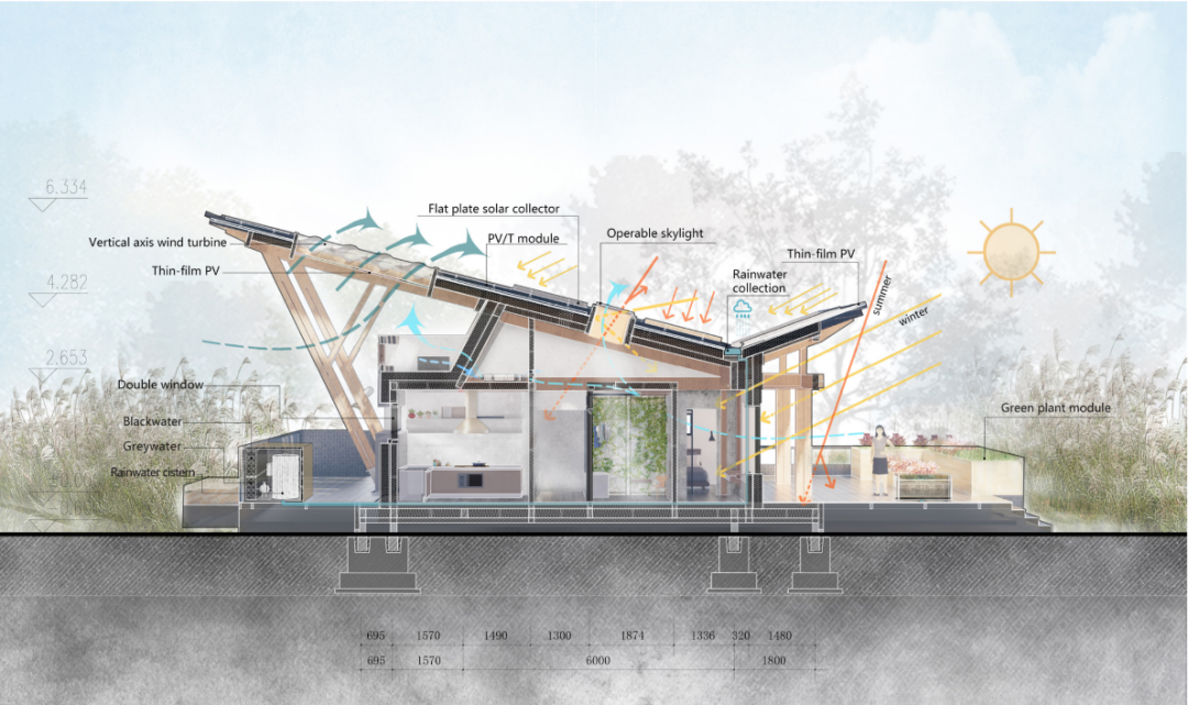 In terms of overall technical strategy, R-CELLS Residence emphasizes the technical concept of "positive energy, full cycle, and zero emissions". Positive energy refers to the energy surplus of the site; full cycle refers to the internal recycling of energy and water, and the recyclability of building materials; zero emission refers to the net zero emission of CO2 during the operation of the building and zero discharge of domestic wastewater from bathing, kitchen and kitchen.