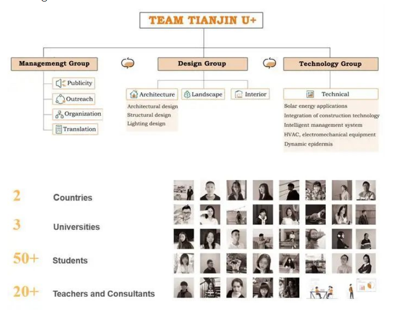 Team Tianjin U+ is led by the School of Architecture, Tianjin University, and unites with APEC Sustainable Energy Center, Construction Engineering, Construction Environment, Automation, Machinery, Intelligence and Computing, International Engineering College, and other internal institutions and disciplines. , Carrying out school-enterprise cooperation with Tianjin University Architectural Design and Planning Institute Co., Ltd., uniting Tianjin Urban Construction University, Oslo School of Architecture and Design, and integrating the technical strength of many enterprises, forming a joint production, education and research team. There are more than 20 team consultants and instructors, and more than 50 participating doctoral students, graduate students, and undergraduates.