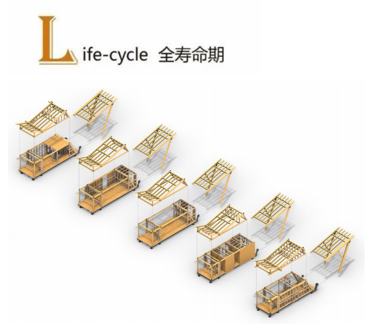 R-CELLS adopts a mixed structural system of heavy wood and balsa wood. The structural frame is heavy-duty glulam made of Douglas fir. The structural wall is composed of SPF balsa wood and SIPs structural insulation board. The structural materials are mainly materials that have low environmental impact or high recycling efficiency, such as wood and metal production and processing, and the physical and chemical carbon emissions including the initial construction, replacement and dismantling stages are small. Use environmentally friendly building materials to achieve the goal of human living health during construction and use.