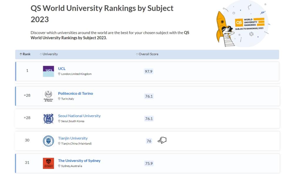 In the 2023 QS World University Rankings by Subjects, Tianjin University ranks 30th in Architecture/Built Environment and placed the 3rd among universities in China Mainland. This year, the QS World University Rankings by Subject has covered 54 subjects and featuring more than 15,700 different academic programmes from 1594 institutions.
