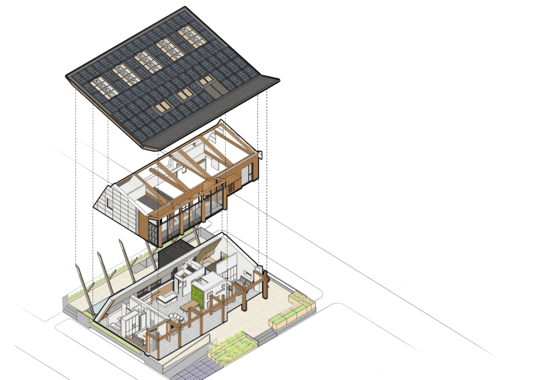 In this sustainable design, the strategy of prioritizing passive design and optimizing active design is implemented. With the innovation of the solar building integration technology, the asymmetric V-shaped roof is designed to maximize passive solar gain in winter, while providing sufficient space for active solar energy use.